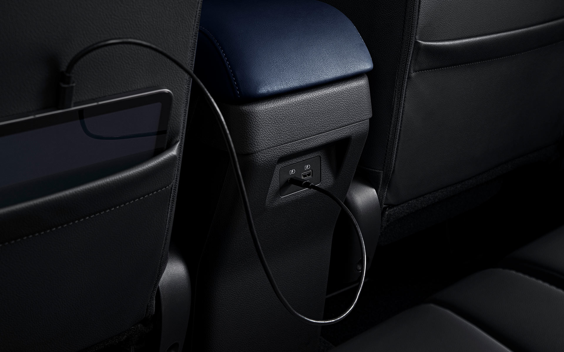 Bệ tỳ tay được trang bị 2 cổng sạc USB ở phía sau cho hàng ghế 2: 01 cổng USB Type-A và 01 cổng USB Type-C